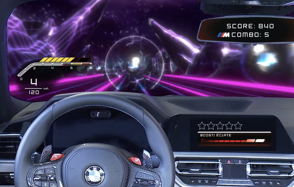 Participants took control of a real vehicle via livestream on mobile or desktop and navigated through a custom Unity racecourse, seeing their movements in the virtual world translate to real world movement, like the steering wheel and the, in addition to dynamic AR overlays on the dashboard, windshield and rearview mirror.
