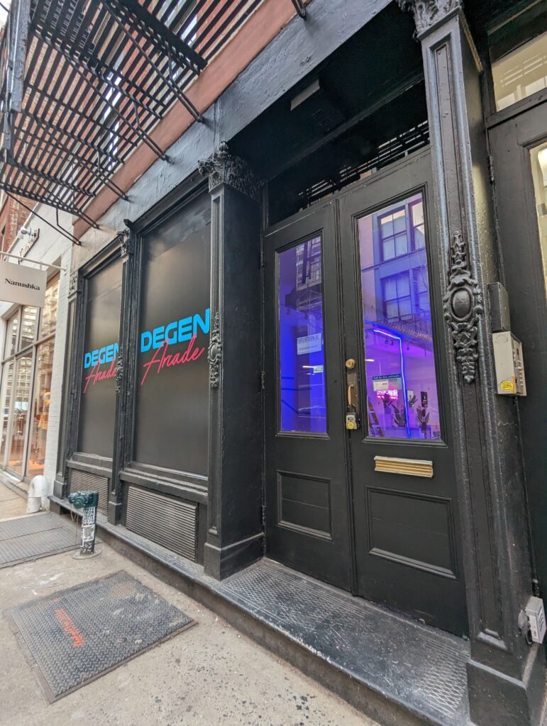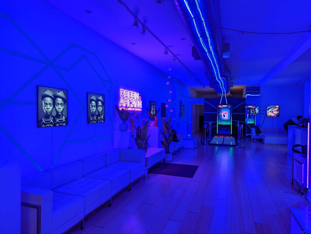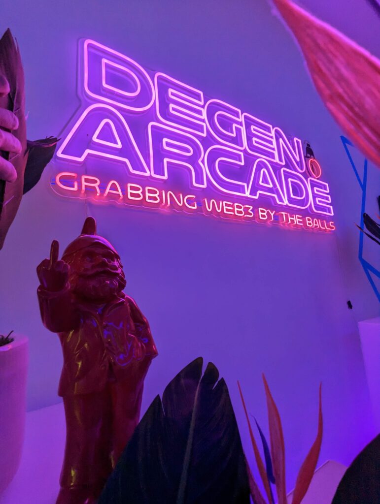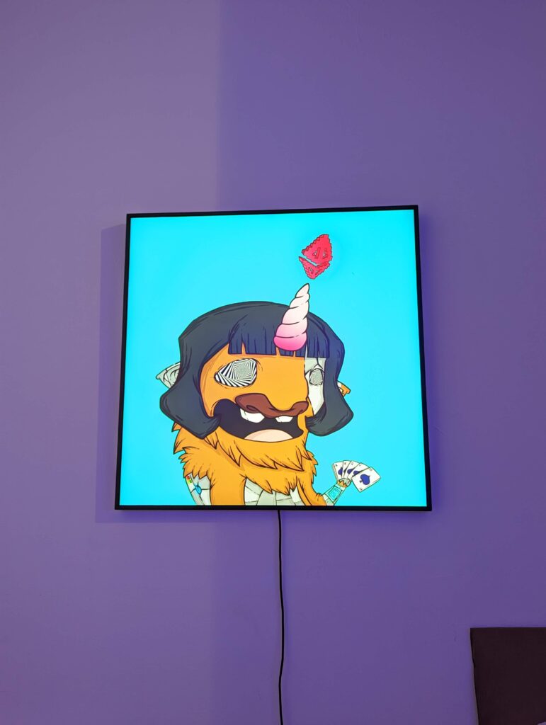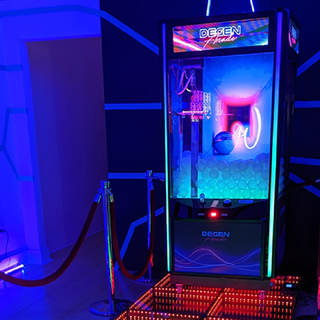 During each play session, NFT artwork was fetched in the background and revealed on a rear display following a successful win, framed within custom-branded visuals.