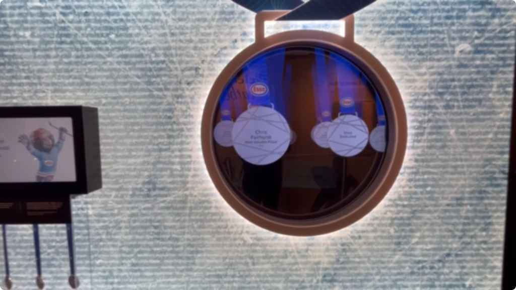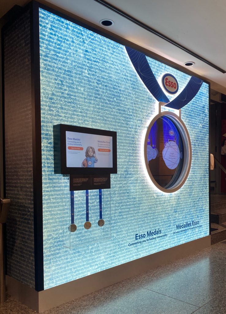 This custom installation celebrates the legacy of the Esso Medals of Achievement program, a cornerstone of Canadian youth hockey for over 40 years.