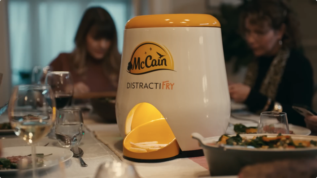 The McCain DistractiFRY listens for keywords in questions that most of us hope to avoid. When it hears awkward dinner conversation phrases like “Got a job yet?” or “When are you getting married?”, it dispenses hot and crispy McCain french fries to cleverly divert everyone’s attention.