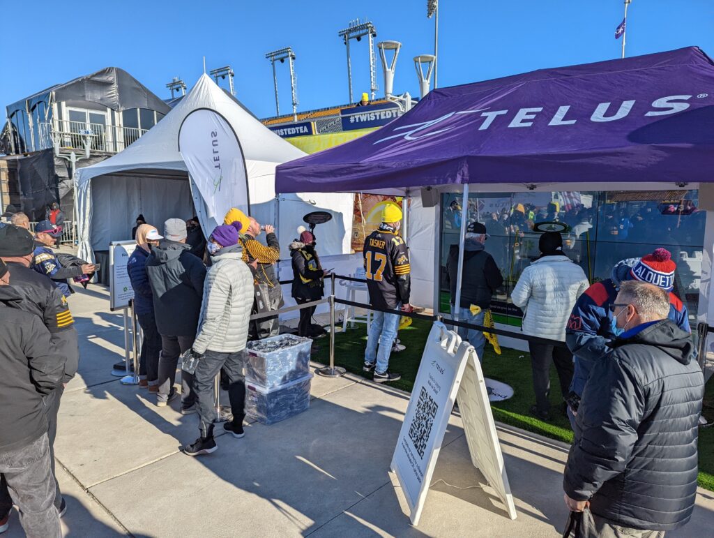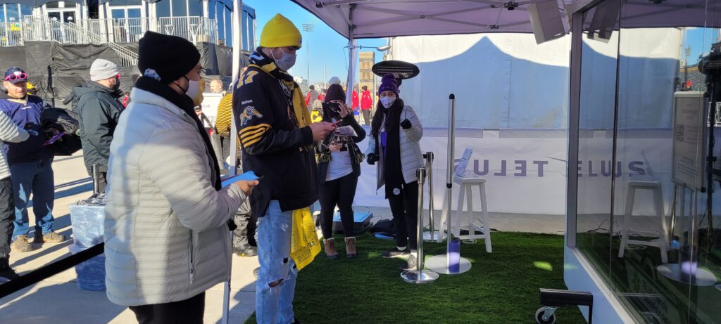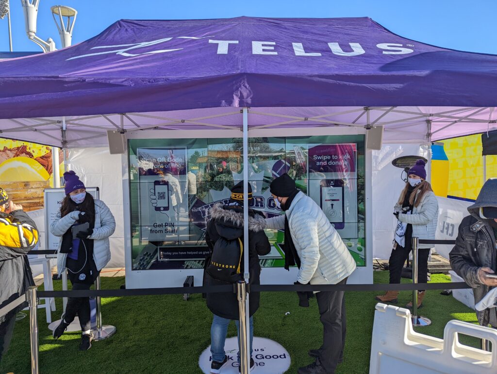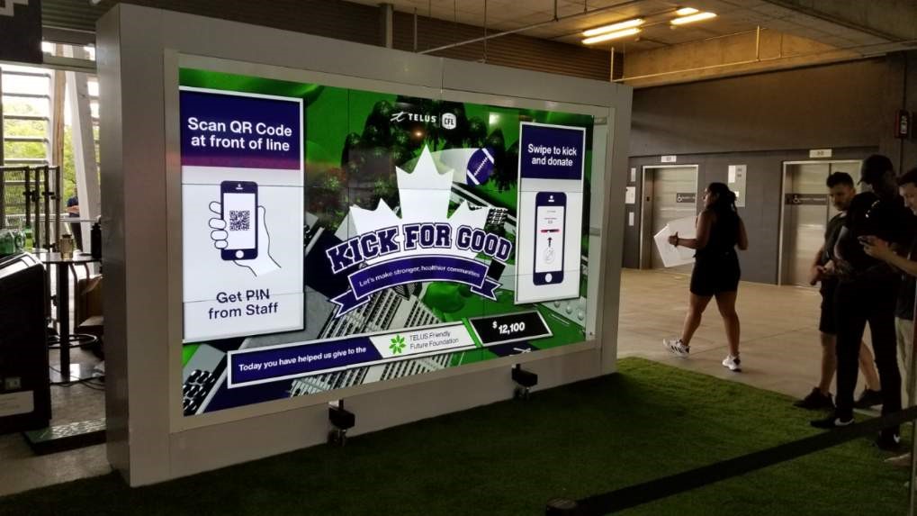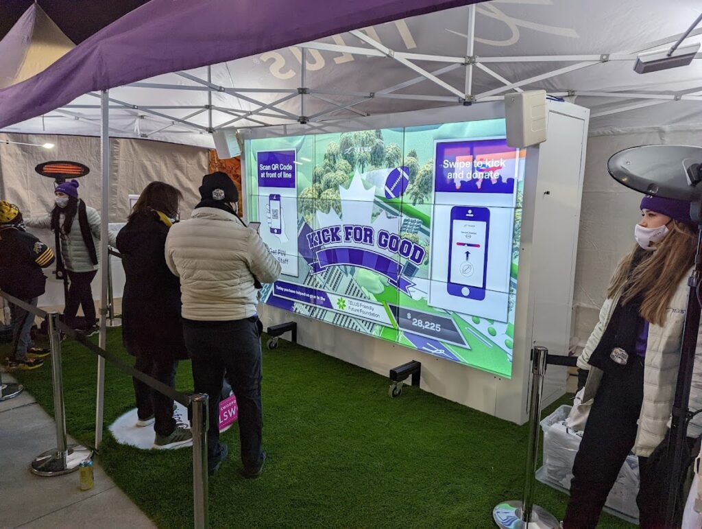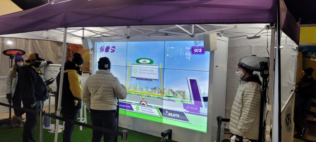 For TELUS, we designed and developed an interactive game experience that connected fans’ actions directly to a charitable outcome. Using their own mobile devices, participants swiped to kick virtual footballs toward the uprights, with each successful kick contributing to a live donation counter displayed on a large LED video wall.