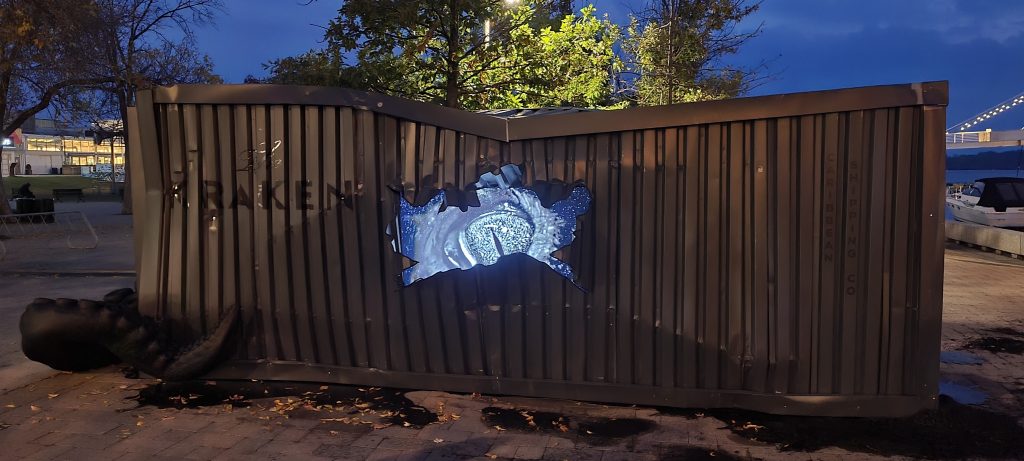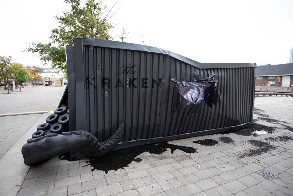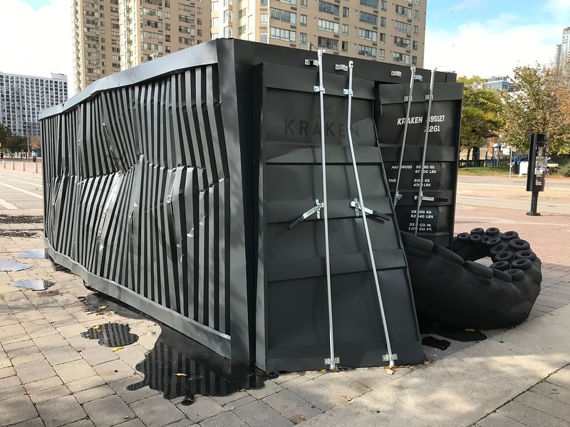 Trapped in a shipping container stolen from the side of a cargo ship, the Kraken peered out from inside the container and wailed in anger at consumers passing by. The crate itself expanded and contracted as the Kraken pushed to escape.